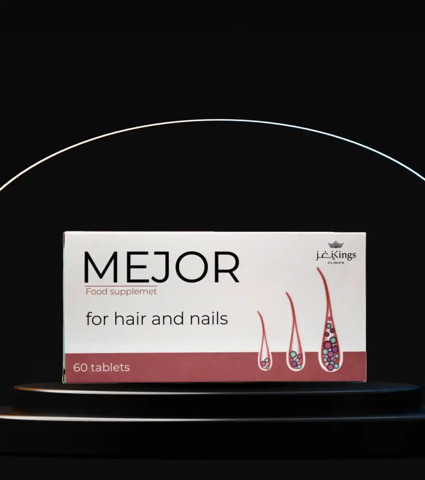يدرك مركز كينغز أن العلاجات الموضعية وحدها قد لا تكون كافية. للحصول على شعر صحي وقوي بشكل دائم، يجب توفير التغذية الأساسية التي تحتاجها البصيلات من الداخل. لهذا السبب، نقدم لكم مكمل “MEJOR” الغذائي، الذي تم تصميمه بعناية لدعم صحة الشعر والأظافر.